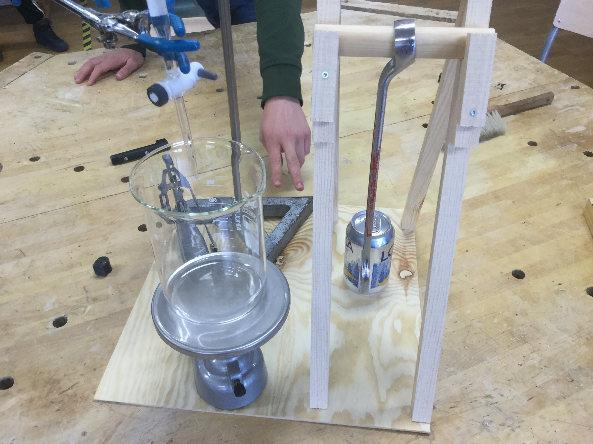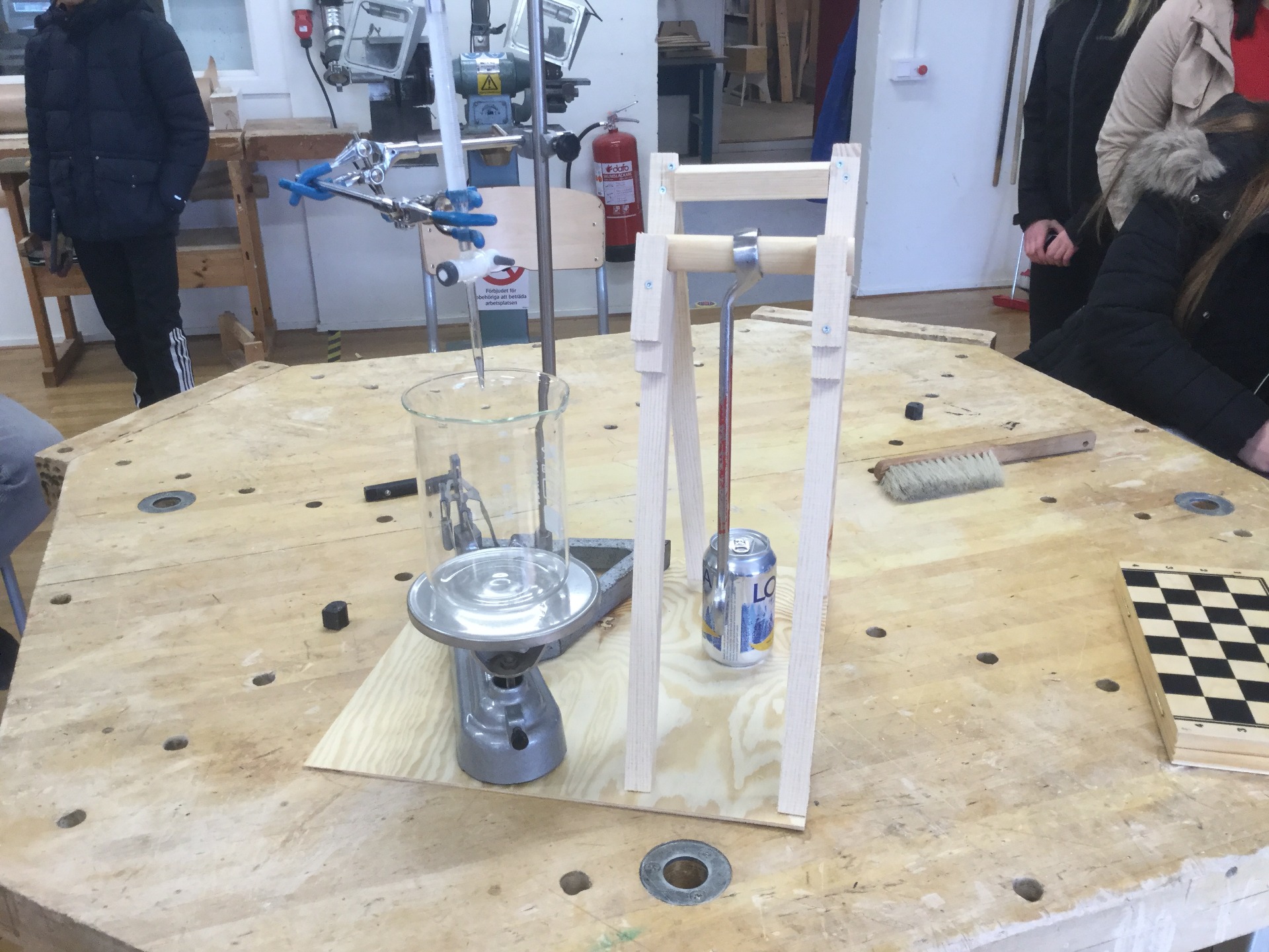 Vi har gjort en träplatta som allting står på, använder oss utav ett dropprör